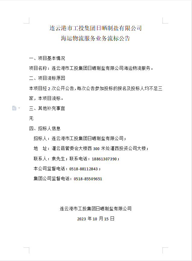 連云港市工投集團日曬制鹽有限公司海運物流服務業(yè)務流標公告
