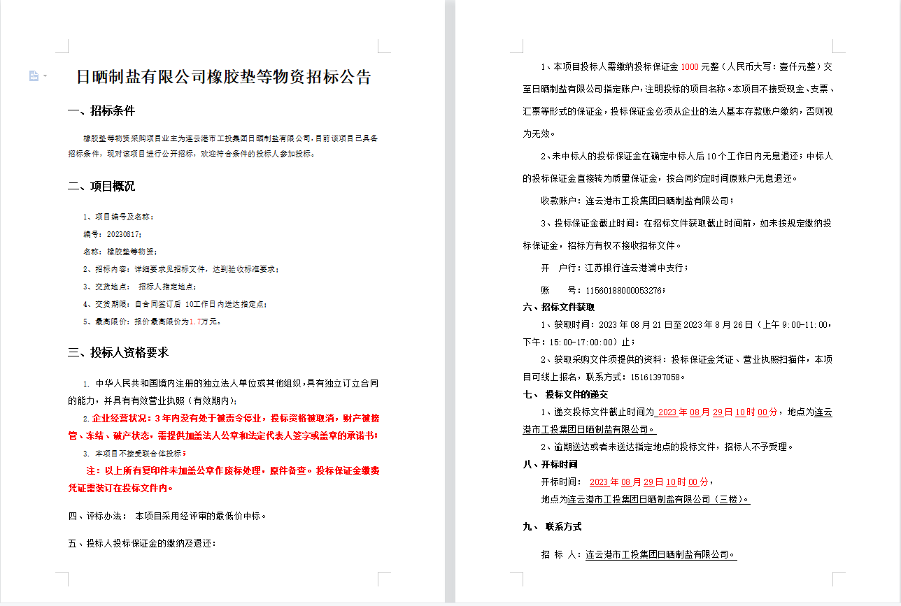 日曬制鹽有限公司橡膠墊等物資招標公告