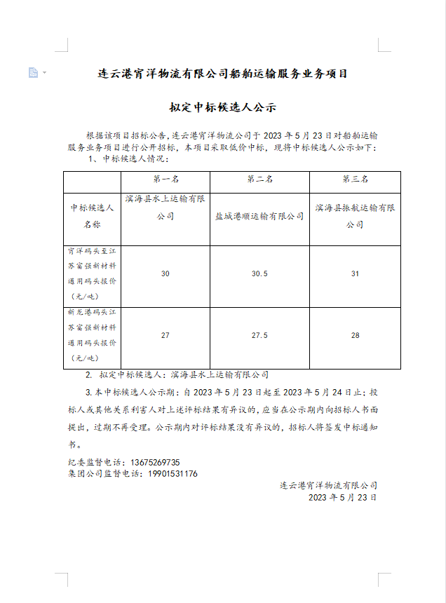 連云港宵洋物流有限公司船舶運輸服務(wù)業(yè)務(wù)項目擬定中標候選人公示