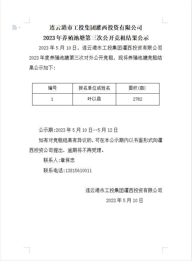 連云港市工投集團(tuán)灌西投資有限公司2023年養(yǎng)殖池塘第三次公開競租結(jié)果公示
