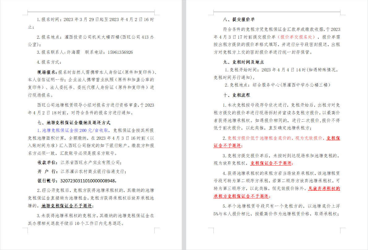 江蘇省西旺水產(chǎn)實(shí)業(yè)有限公司2023年度淡水養(yǎng)殖池塘公開競租第二次公告