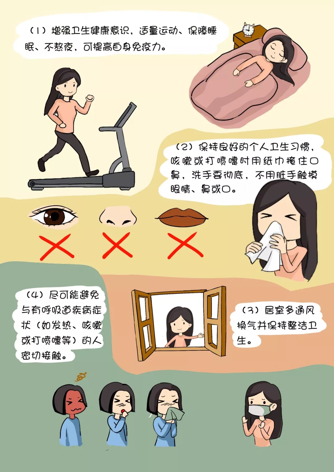 (1)增強衛(wèi)生健康意識,適量運動、保障睡眠、不熬夜,可提高自身免疫力。