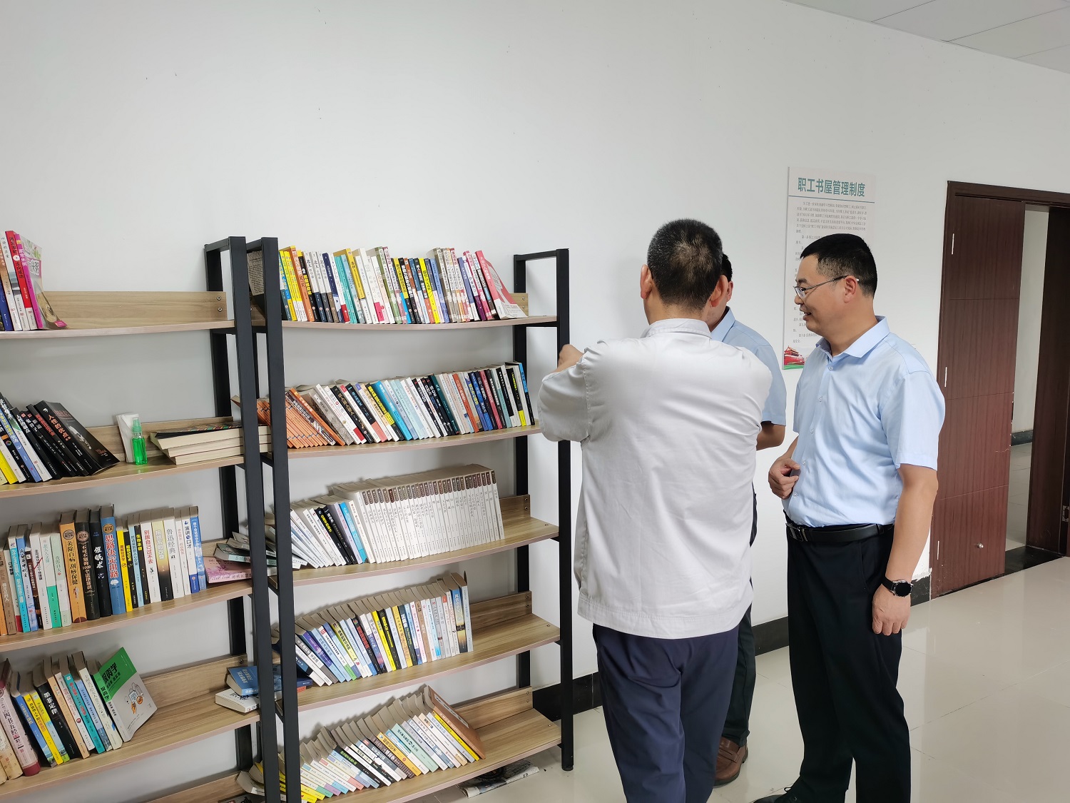 在實地參觀過程中,深入了解了書屋建設(shè)、布局、管理、圖書分類及更新、登記等具體方面的內(nèi)容,并就相關(guān)黨建、工會活動開展情況與神特新材料黨支部副書記、工會主席袁忠等進行了交流討論。