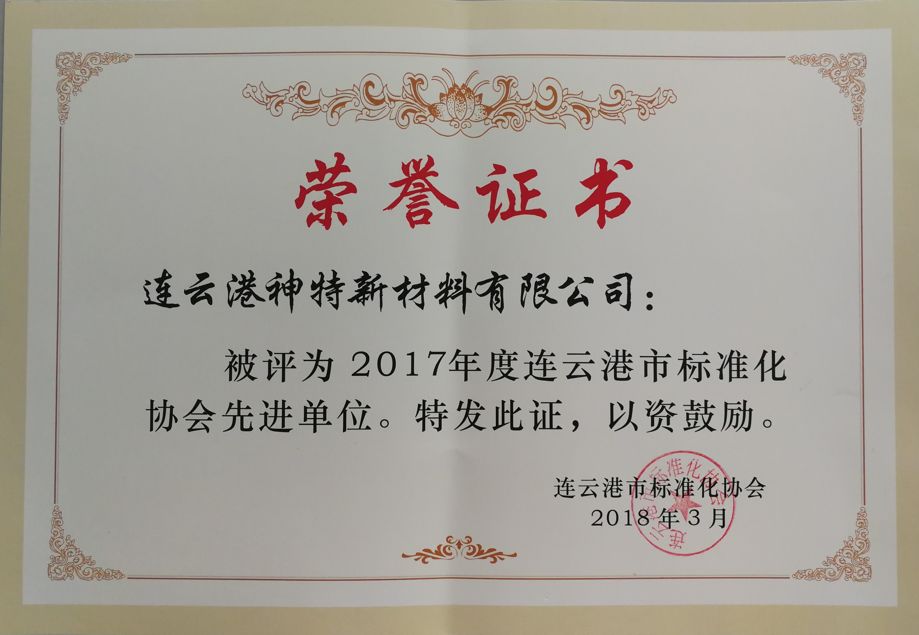 4月2日,神特公司參加由市標準化協(xié)會組織的2018年會員大會,被批準為連云港市標準化協(xié)會團體會員單位,并被評為2017年度連云港市標準化協(xié)會先進單位。