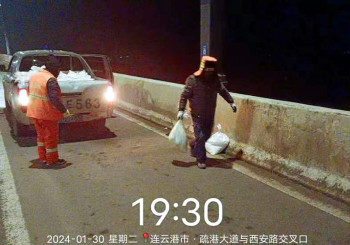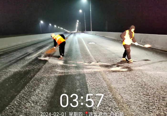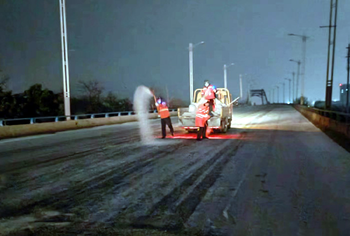 截止早上7點,悅升公司共出動機械設(shè)備10臺、人員260余人,對橋梁和重點結(jié)冰地段使用融雪劑150余噸,及時消除路面冰凍隱患100余處。